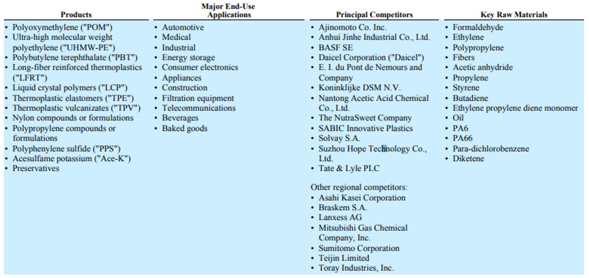 Celanese è una società globale specializzata nella produzione di prodotti chimici e materiali speciali. È un leader mondiale nella produzione di polimeri ingegnerizzati ad alte prestazioni, utilizzati in numerose applicazioni di alto valore, nonché uno dei maggiori produttori globali di prodotti acetilici, che sono intermedi chimici fondamentali per quasi tutte le principali industrie. La catena del valore integrata di Celanese inizia con metanolo e monossido di carbonio. A partire da questi materiali di base, l'azienda produce acido acetico, che può essere ulteriormente trasformato in VAM (acetato di vinile) e altri derivati dell'acido acetico. Il VAM può essere successivamente modificato per produrre emulsioni, polveri polimeriche ridisperdibili e altri prodotti derivati. Il vasto portafoglio di prodotti di Celanese serve numerose e diversificate applicazioni finali, tra cui automotive, additivi chimici, edilizia, adesivi per uso industriale e di consumo, beni di consumo e medici, stoccaggio di energia, filtrazione, alimenti e bevande, vernici e rivestimenti, carta e imballaggi, prestazioni industriali e tessili.