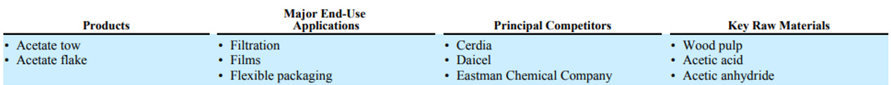 In questo segmento Celanese è un produttore e fornitore leader a livello mondiale di fasci di acetato e fiocchi di acetato, utilizzati principalmente in applicazioni di prodotti filtranti. Celanese detiene una partecipazione di circa il 30% in tre imprese cinesi che producono fiocchi e stoppa di acetato. L’acetato di Cellulosa viene venduta principalmente alle principali aziende produttrici di tabacco che rappresentano la maggior parte della produzione mondiale di sigarette. Il prezzo dei prodotti del segmento Acetate Tow è sensibile alla domanda e si basa principalmente sul valore d'uso. Molte vendite sono effettuate in base a contratti che prevedono prezzi per uno o più anni. Di conseguenza, i margini possono espandersi o contrarsi in risposta ai cambiamenti delle condizioni di mercato in questi periodi simili e potremmo non essere in grado di adeguare i prezzi a causa di altri fattori, come l'intenso livello di concorrenza nel settore.
