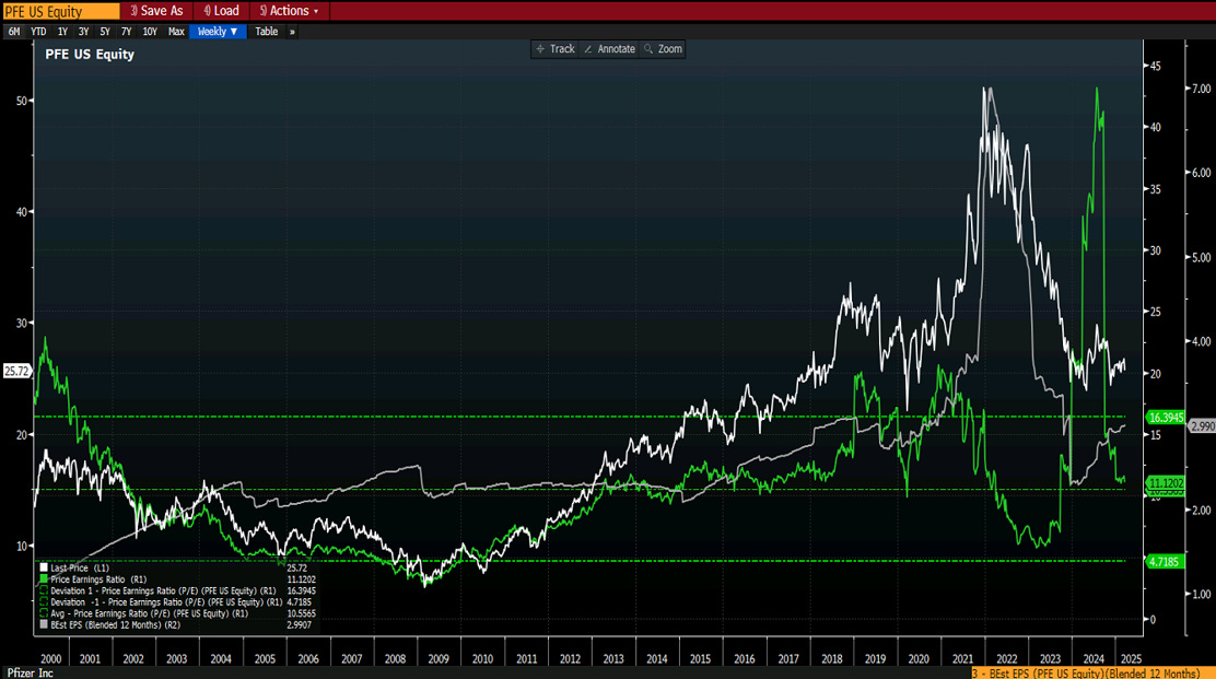 Pfizer è valutata a 11x P/E, in linea con la media degli ultimi 20 anni:
