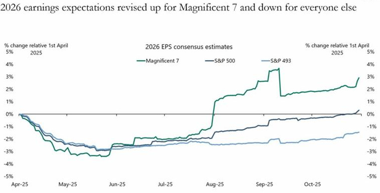 Se guardiamo oltre l’AI, i segnali non sono altrettanto brillanti, gli investimenti residenziali restano compressi dall’inaccessibilità degli immobili; gli investimenti corporate tradizionali, fuori dai big tech, sono modesti; l’occupazione mostra segni di affaticamento; il consumo fuori dalla fascia alta è debole; molte aziende dell’S&P 500 – le “493” – vedono aspettative di utili stagnanti o negative per il 2026.