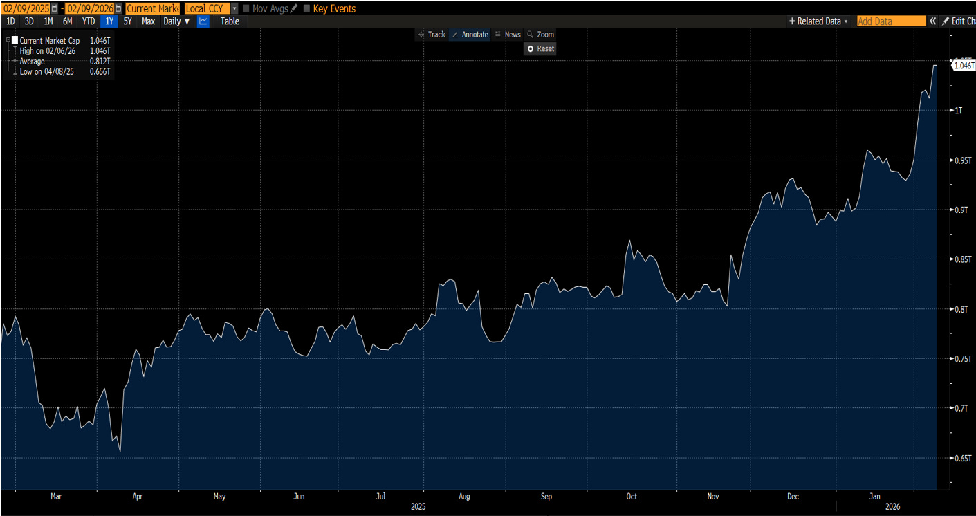 Mentre le Magnifiche 7 stanno correggendo, nel silenzio un titolo emblema della difensività, come Walmart, ha superato per la prima volta i 1.000 miliardi di dollari di capitalizzazione, entrando nel cosiddetto trillion dollar club. Un club storicamente dominato quasi esclusivamente da aziende tecnologiche, con pochissime eccezioni come Berkshire Hathaway.