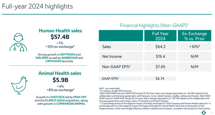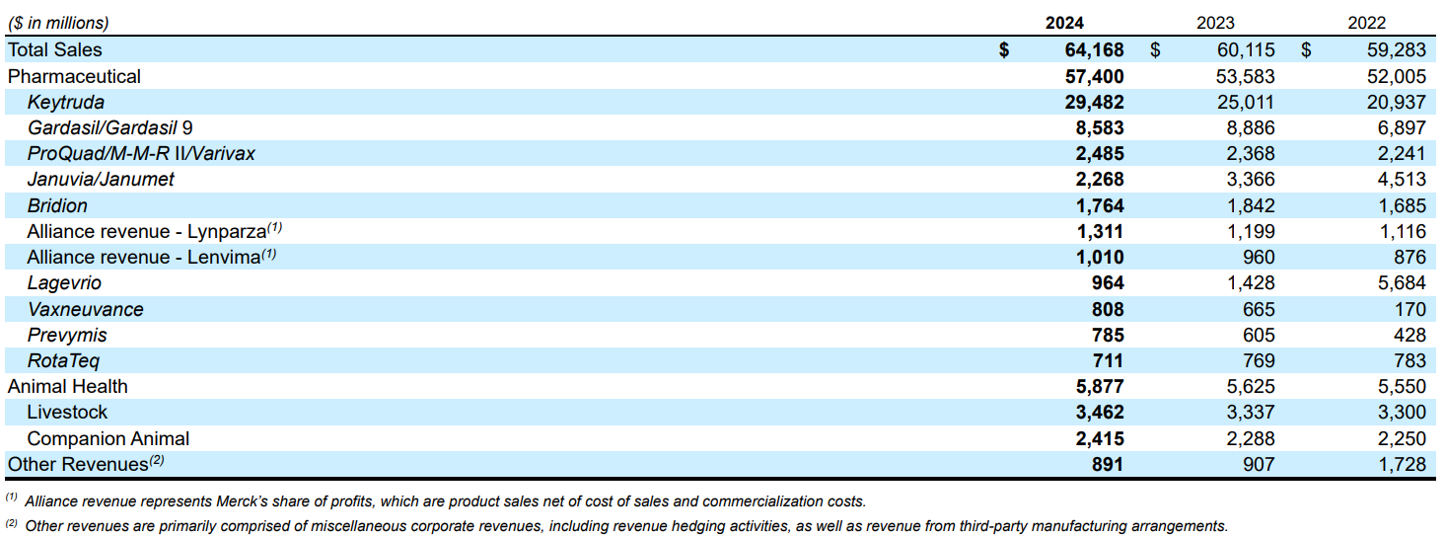 Le principali franchise per fatturato nel 2024 sono state: Keytruda (oncologia), Gardasil (vaccini), ProQuad (vaccini), Januvia (diabete), Bridion (terapie ospedaliere acute) e Lagevrio (virologia).