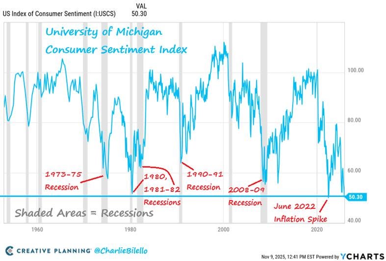 Anche i dati sul sentiment dei consumatori raccontano una storia contraddittoria. La fiducia dei consumatori dell’Università del Michigan è scesa a 50,3, il secondo valore più basso mai registrato dal 1952.