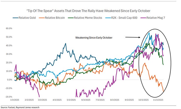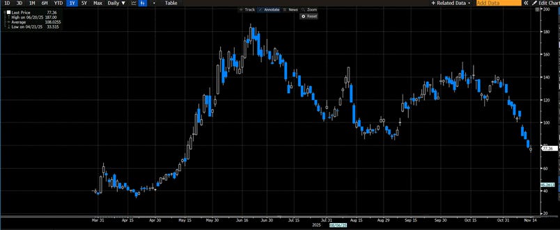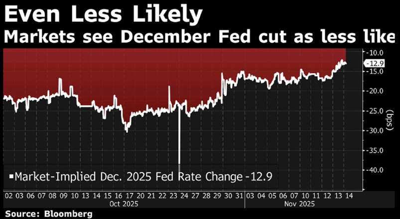Da una parte il sentiment migliora grazie alla fine del più lungo shutdown governativo nella storia degli Stati Uniti, durato 43 giorni, che dovrebbe riportare un po’ di chiarezza sui dati economici sospesi. Tuttavia, l’umore degli investitori resta incerto e le probabilità di un taglio dei tassi da parte della Fed a dicembre sono scese dal 70% a circa il 50%, dopo i recenti commenti di alcuni membri più cauti del board, come Bostic e Collins.