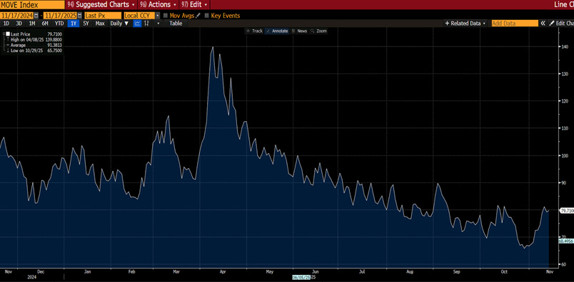 Questa persistenza, insieme ad una lettura difficile sull`andamento del mercato del lavoro, alimenta la prudenza della Fed. Williams, presidente della Fed di New York, ha parlato apertamente della possibilità di “tornare ad acquistare asset” per stabilizzare il mercato dei finanziamenti overnight, che mostra nuove tensioni. Un linguaggio che evoca, di fatto, l’ipotesi di un ritorno del quantitative easing. Così la volatilità dei Treasuries, misurata dal MOVE Index , è salita sensibilmente, segnalando instabilità e potenziale rischio d’irrigidimento nei mercati obbligazionari.