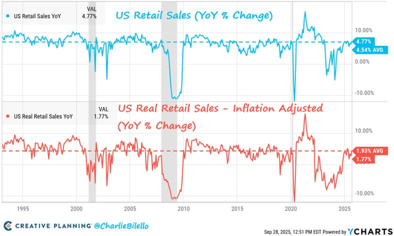 Eppure, nello stesso periodo, le vendite al dettaglio sono cresciute del 4,8% su base annua, ben sopra l’inflazione, segno che la spesa delle famiglie resta sostenuta.