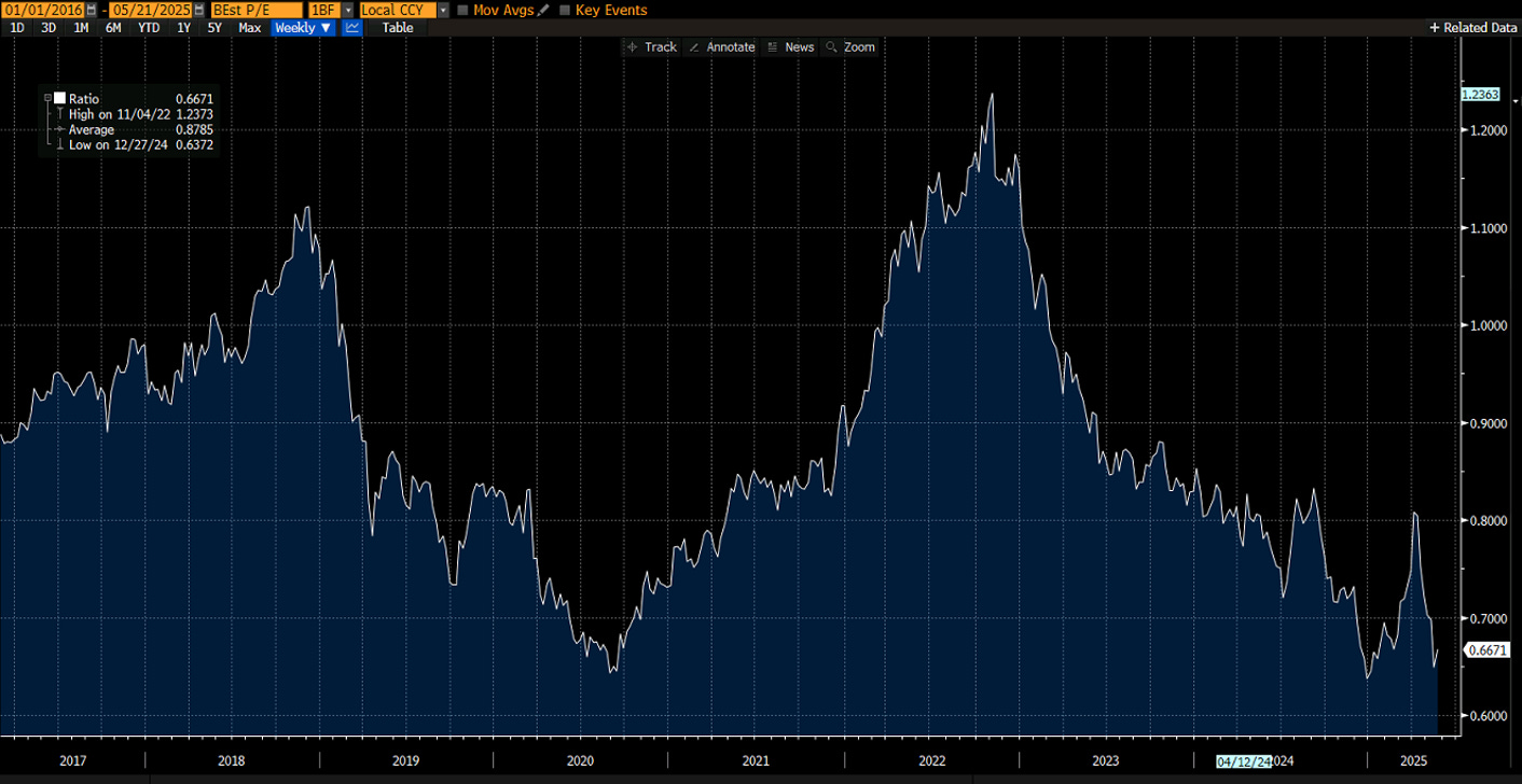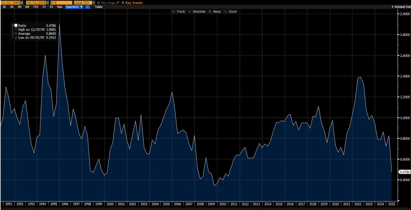2. Queste aziende sono a sconto del 47% rispetto al mercato, come vediamo dal grafico sottostante che mostra il rapporto fra il PE delle aziende e quelle del mercato che si trova vicino ai minimi del 2009: