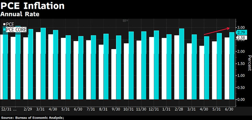 I dati di giugno mostrano che l’inflazione misurata dall’indice PCE – il preferito dalla Fed – è rimasta praticamente ferma: +2,6% per il dato headline e +2,8% per il core su base annua. Questi livelli sono sostanzialmente invariati da inizio anno, suggerendo che il processo disinflazionistico si è interrotto.