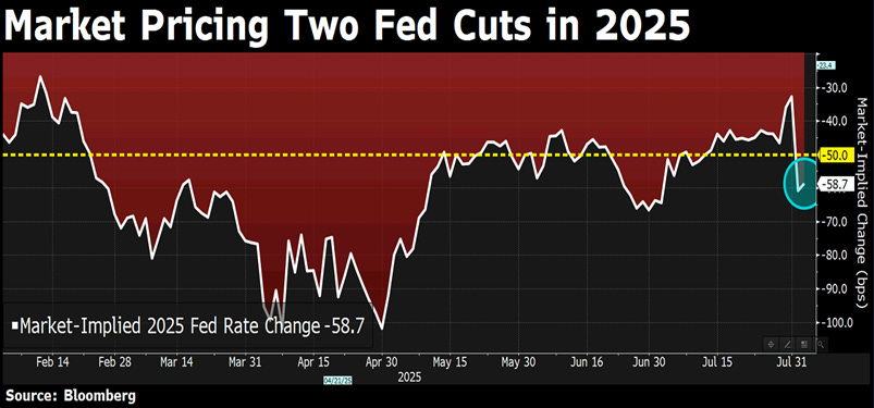 Mentre il rendimento dei titoli del Tesoro a 10 anni è sceso di 17 punti base e quello a 2 anni ancora di più, poiché il mercato obbligazionario ha scommesso che, dopo la pausa di questa settimana, la debolezza dell'economia costringerà la Fed a tagli a settembre e oltre.