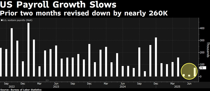 A pesare sul sentiment è stato un mix di dati macroeconomici che ha fatto riaffiorare timori di stagflazione: mentre il mercato del lavoro e la spesa per i consumi, due pilastri della domanda interna, hanno mostrato segnali evidenti di indebolimento. In particolare hanno colpito i dati molto deboli sul mercato del lavoro con le buste paga per il settore non agricolo uscite a 73.000 al di sotto delle attese di 104.000 con una revisione a ribasso dei dati di maggio e giugno di ben 258.000 posti di lavoro. A complicare ulteriormente il quadro, venerdì Trump ha licenziato la responsabile delle statistiche sull’occupazione, accusandola di aver fornito dati errati.