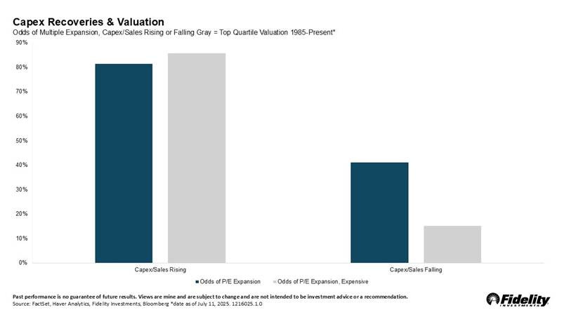 La storia suggerisce che i periodi in cui il rapporto capex/fatturato cresce coincidono spesso con una maggiore probabilità di crescita degli utili. Non solo. Queste fasi sono spesso accompagnate da espansione dei multipli. Perché i mercati anticipano. Se gli utili futuri si preannunciano solidi, i prezzi tendono ad aggiustarsi prima che i fondamentali si manifestino pienamente. E attenzione: anche quando i mercati sembrano “cari”, la storia suggerisce che questo non è necessariamente un limite. In realtà, i cicli di capex che partono con valutazioni elevate hanno, storicamente, mostrato ancora più probabilità di ulteriori rialzi dei multipli. Valutazioni alte, in questo senso, sono un segnale di fiducia – non di eccesso.