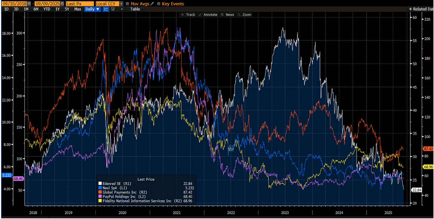 In realtà Edenred si sta comportando come il settore dei pagamenti che da ormai 5 anni è sotto attacco di Mr. Market.