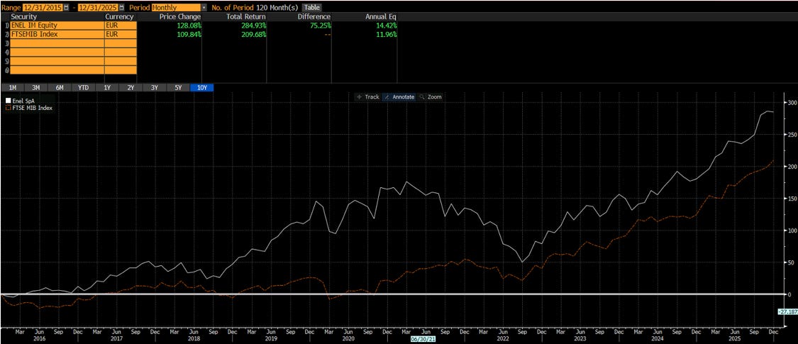 Ma se estendiamo l`analisi ad un orizzonte temporale di 10 anni possiamo vedere come, nonostante la difensività del business, Enel sia stata in grado di sovraperformare il mercato generale (FTSEMIB) consegnando agli investitori un ritorno annualizzato del 14.4%, dimostrando che un business difensivo può creare valore nel tempo.