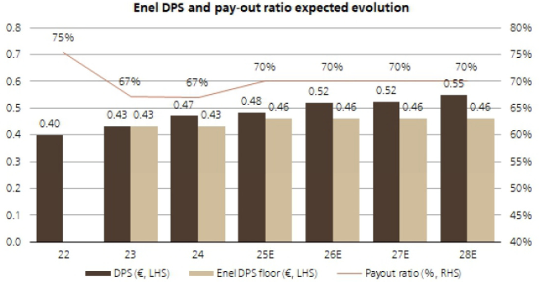 Dentro questa cornice, l’outlook 2025 comunicato dalla società conferma una traiettoria sotto controllo: EBITDA ordinario 22,9–23,1 miliardi e utile netto ordinario atteso lievemente sopra la parte alta del range 6,7–6,9 miliardi. Sul fronte azionisti, è stato deliberato un acconto dividendo 2025 di 0,23 €/azione (pagamento 21 gennaio 2026) e viene ribadita la logica del floor a 0,46 € per l’intero 2025.