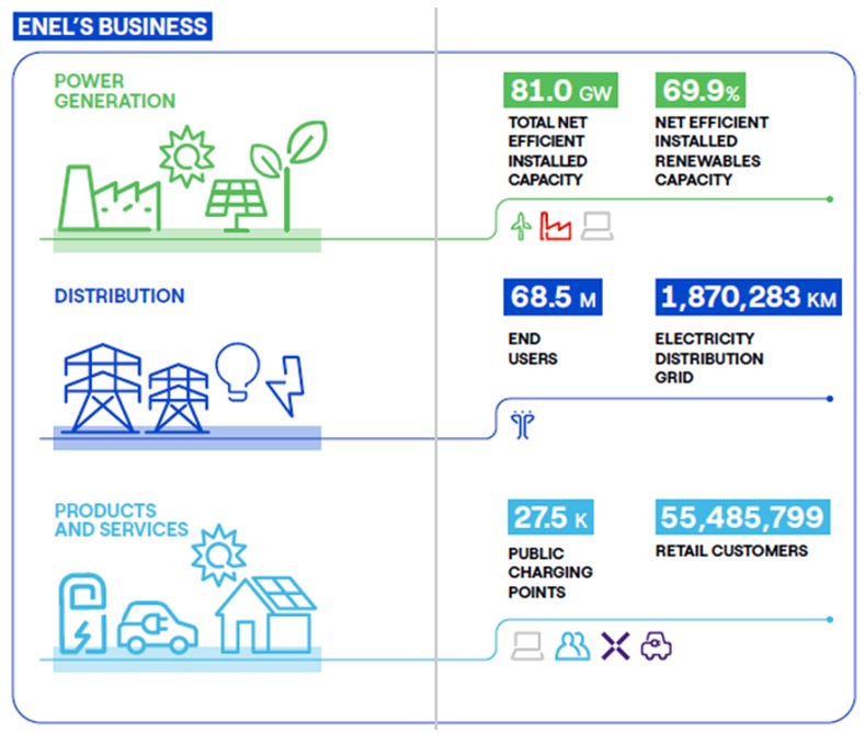 Geograficamente Enel è un gruppo globale, ma con un baricentro chiaro: Italia e Spagna restano centrali, con una presenza molto importante anche nelle Americhe (in particolare Brasile, Cile e Colombia). E la scala è davvero grande: nel 2024 Enel indica circa 1,87 milioni di km di rete e 55,5 milioni di clienti retail. Sono numeri che aiutano a capire perché, per Enel, la dimensione non è solo un dato: è una leva industriale.