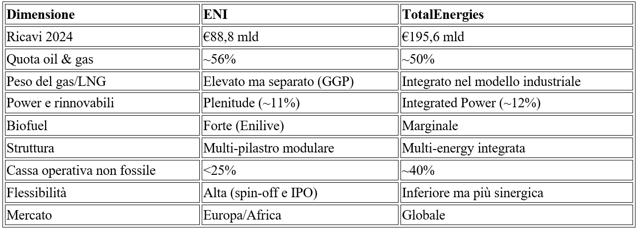 Il modello “multi-pilastro” consente di valorizzare singolarmente le divisioni (IPO Plenitude, JV gas) e finanziare la transizione con la cassa dell’upstream.TotalEnergies, al contrario, adotta un approccio multi-energy integrato: upstream, LNG, power e marketing operano in un unico ecosistema industriale.