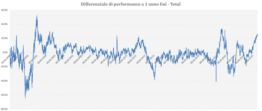 Negli ultimi dodici mesi, il titolo ENI ha sovraperformato TotalEnergies di oltre il 25%, un gap che non trova spiegazione immediata nei fondamentali.
