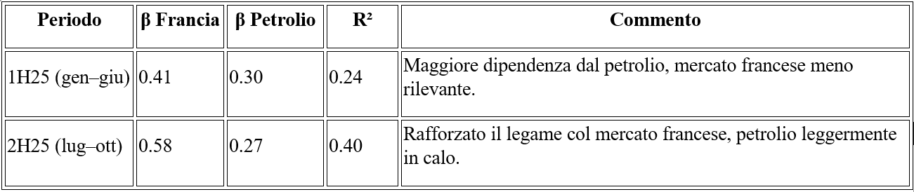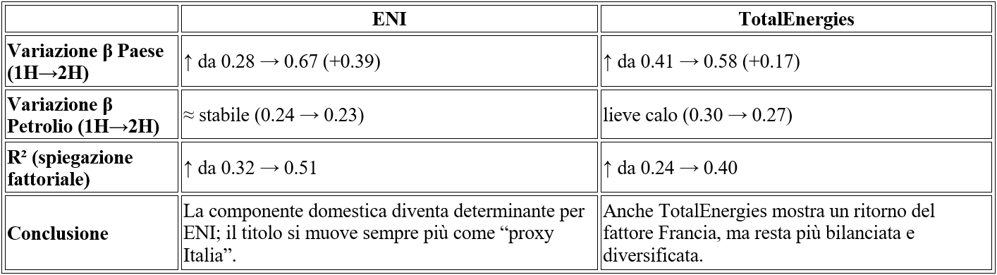 Nel secondo semestre, invece, il peso del fattore Paese è raddoppiato (β Italia 0.28 → 0.67), riflettendo un re-rating del rischio sovrano italiano e un ritorno di flussi su equity domestiche.Per TotalEnergies, il fattore Francia è salito da 0.41 a 0.58, ma il modello resta più diversificato, con R² inferiore (≈0.40).