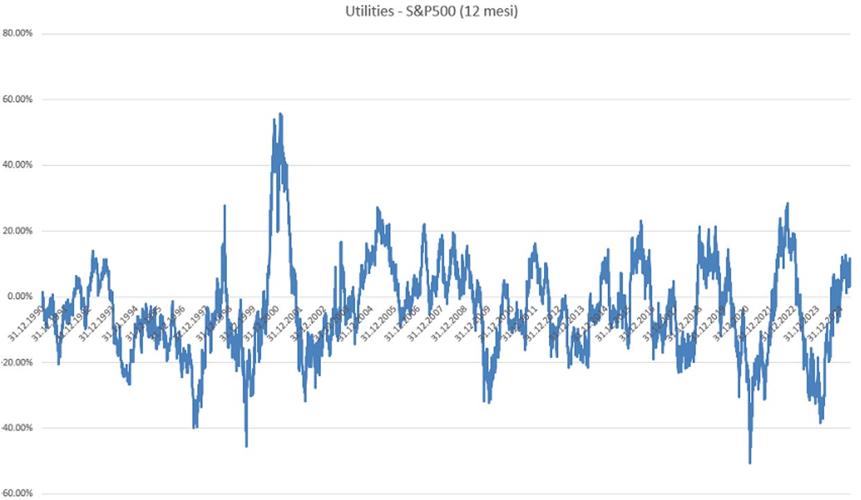 Per esempio a inizio 2024 avevamo raggiunto un picco di negatività del settore utilities con una sotto-performance a 12 mesi rispetto al mercato del -40%.