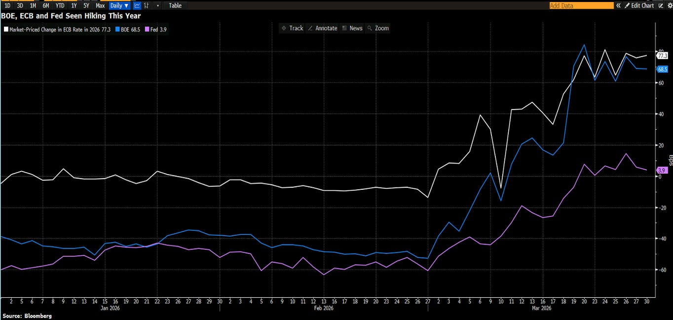 E infatti lo stiamo vedendo chiaramente. Il petrolio che risale sopra i 100 dollari riporta immediatamente pressione sui rendimenti obbligazionari e riduce ulteriormente lo spazio per la Fed e le altre banche centrali di tagliare i tassi, anzi, aumenta addirittura le aspettative di rialzi dei tassi.