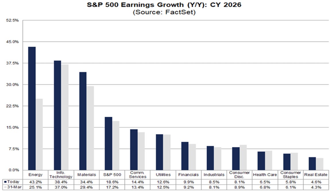 Naturalmente, non tutta questa crescita è distribuita in modo uniforme. Anzi, qui emerge un altro punto fondamentale. Le revisioni al rialzo sono state trainate in larga parte da pochi settori: soprattutto tecnologia, energia e in misura minore materiali di base. Questo significa che il mercato non sta premiando in modo indiscriminato tutto l’azionario: sta premiando i segmenti che oggi mostrano più capacità di espansione degli utili e dei margini.