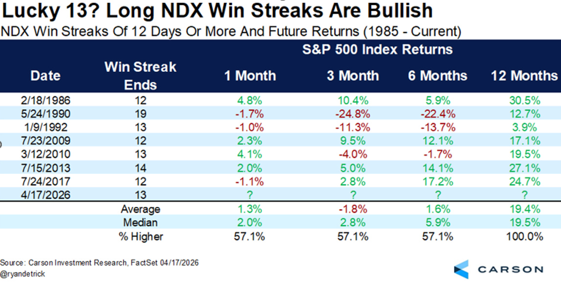 E anche qui la storia offre uno spunto interessante. Nelle altre sette occasioni in cui il Nasdaq aveva registrato almeno 12 sedute consecutive di rialzo, l’indice risultava sempre più in alto dodici mesi dopo, con una performance media superiore al 19%.