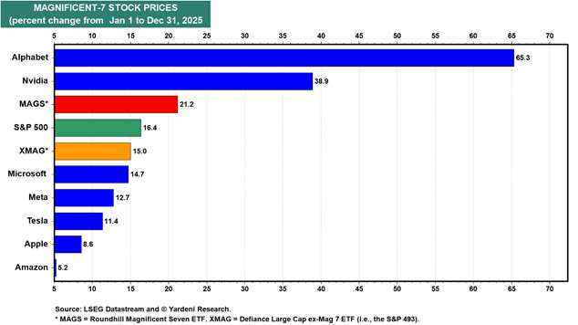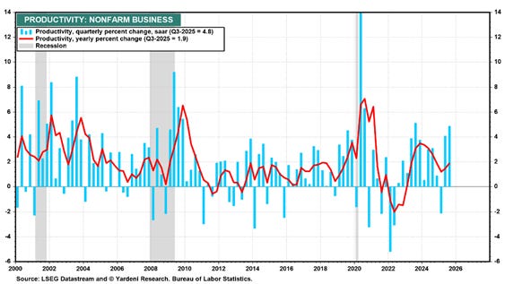 Nel frattempo, però, l’IA sta iniziando a fare ciò che conta davvero: aumentare la produttività. I dati lo mostrano chiaramente, con la produttività non agricola in crescita del 4,9% nel terzo trimestre 2025. Questo suggerisce un possibile passaggio di testimone: meno entusiasmo concentrato su pochi titoli “iconici” e più benefici diffusi sull’insieme dell’economia e sulle restanti 493 società all`interno dell`indice, che possono sfruttare l’IA per migliorare efficienza, margini e utili.