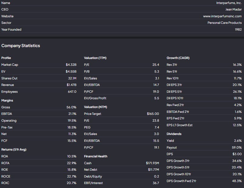 Crescita superiore al mercato: Nel 2024, Interparfums ha segnato il suo miglior anno di sempre, con vendite nette in crescita del 10% a $1,45 miliardi e una guidance 2025 che prevede ulteriori aumenti di ricavi ed EPS. La crescita annua attesa (7-10%) supera quella media del settore (6%).