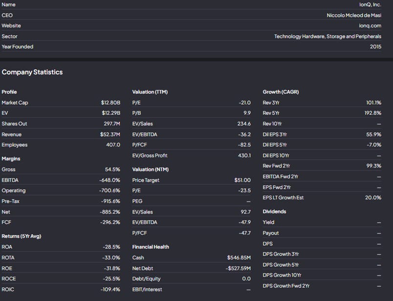 IonQ non genera utili ed anche il suo EBITDA è negativo, secondo le stime degli analisti la società dovrebbe iniziare a generare utili a partire dal 2030. Gli investimenti sono molto consistenti, basti pensare che le spese di ricerca e sviluppo ammontano a circa 150 milioni di dollari all`anno. Ha raccolto $1 mld tramite equity, portando in cassa circa $1,6–1,7 mld per sostenere la commercializzazione e l’espansione tecnologica. La crescita potenziale è ovviamente molto elevata ma ad oggi la visibilità resta troppo bassa.