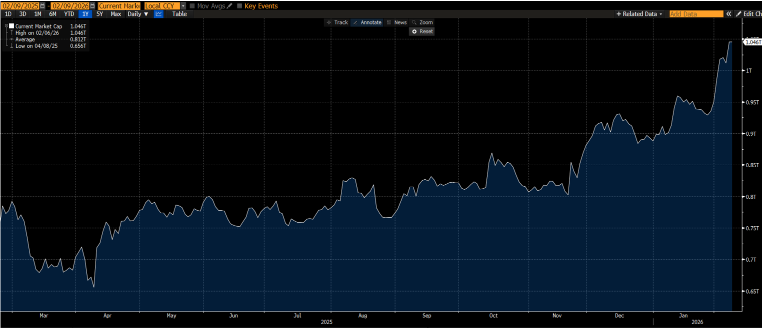 Quando un titolo come Walmart, come vediamo dal grafico sottostante che ci mostra la capitalizzazione totale del titolo, entra nel “trillion dollar club”, ovvero supera il trilione di dollari di capitalizzazione, l’errore più comune è trattarlo come una curiosità statistica.
