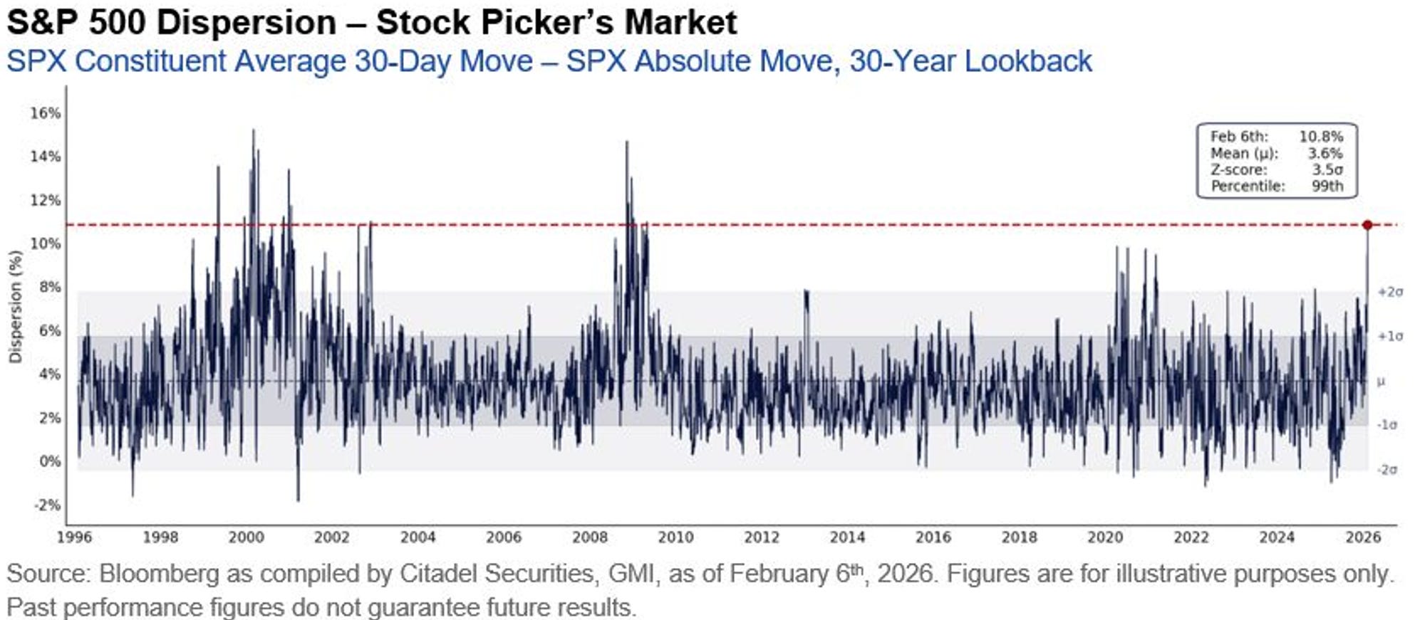 In realtà, dentro quell’indice apparentemente tranquillo, si sta svolgendo qualcosa di raro: la dispersione tra i singoli titoli ha raggiunto uno dei livelli più alti dal 2008. Significa che le azioni vincenti e quelle perdenti si stanno muovendo in direzioni sempre più opposte, con scarti enormi tra settore e settore.