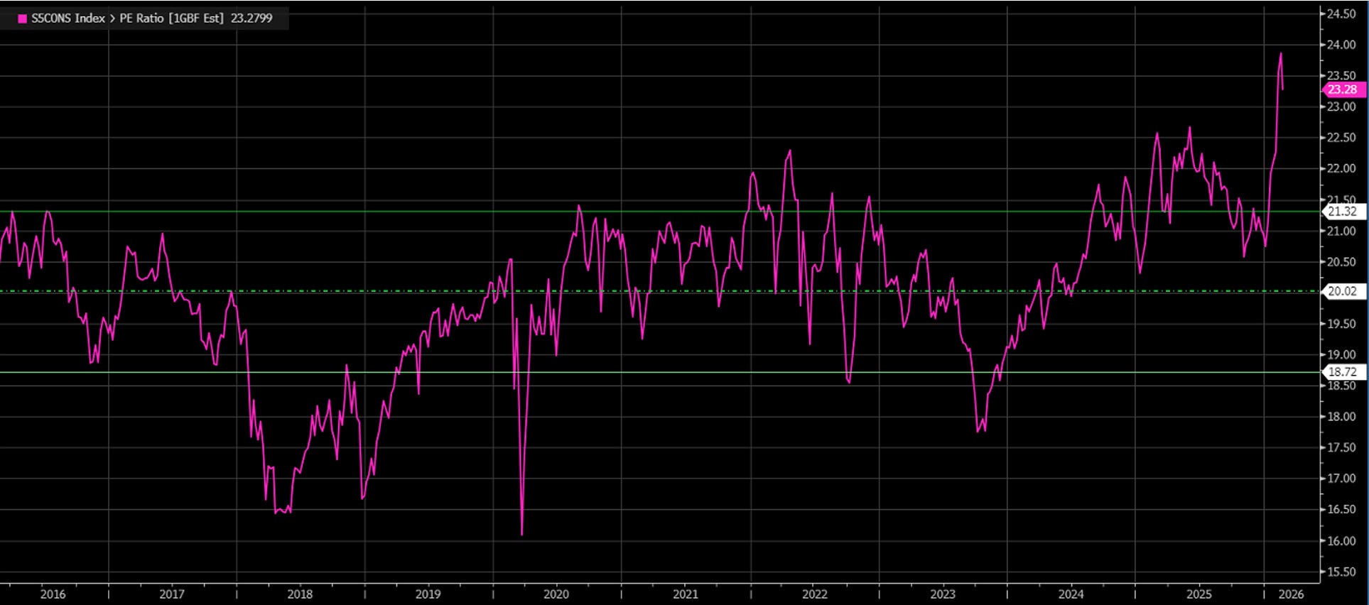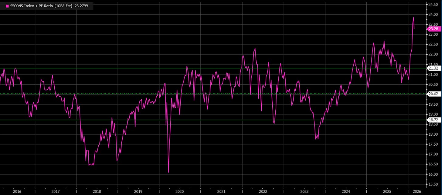In questo momento, alcune di queste aziende trattano a 40-45 volte gli utili — quasi il doppio delle aziende tecnologiche. Con una differenza fondamentale: la loro crescita è molto più lenta.