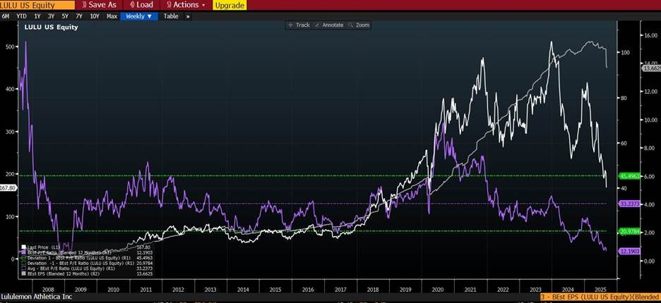 Attualmente Lululemon si trova sul minimo valutativo a 20 anni con un PE intorno a 12x: