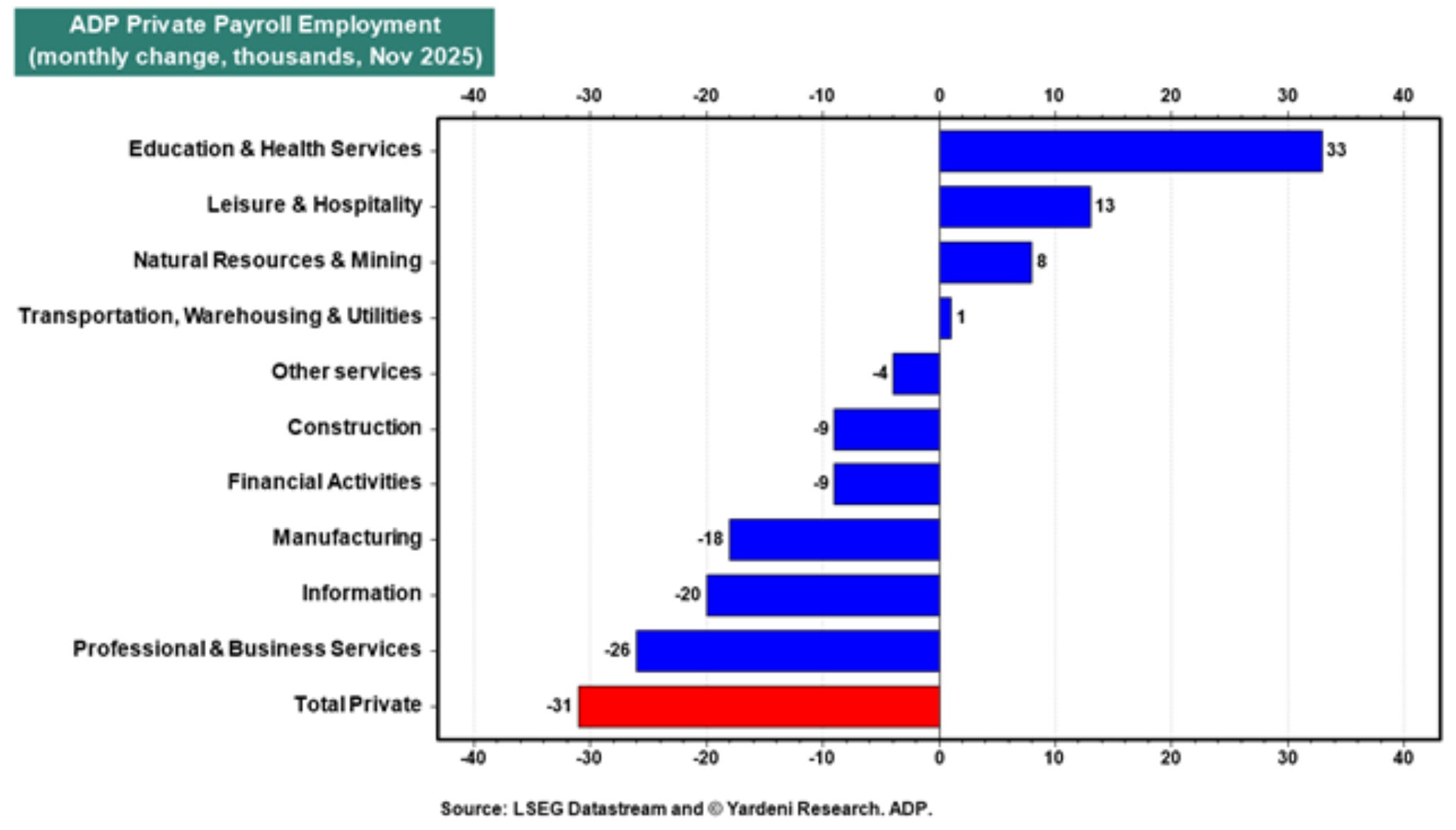 I dati ufficiali risultano distorti dallo shutdown, mentre quelli privati (come ADP) mostrano un indebolimento: per la prima volta dalla pandemia la media trimestrale dell’occupazione diventa negativa, con perdite concentrate nelle piccole imprese e in alcune regioni come il Nord-Est. Le aziende più grandi continuano ad assumere, mentre le realtà sotto i 50 dipendenti riducono il personale. Aumenta la disoccupazione tra i giovani 20–24 anni, categoria che fatica ad adattarsi alle nuove competenze richieste, anche per effetto dell’AI. Le richieste iniziali di sussidio restano basse, segnale che i licenziamenti non stanno esplodendo, ma i tempi per trovare un nuovo lavoro si stanno allungando.