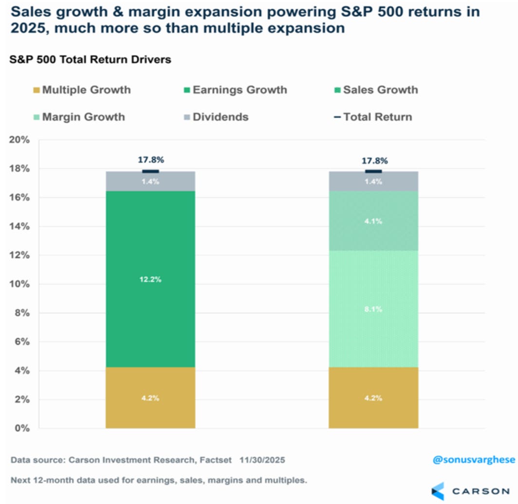 In pratica, se scomponiamo il rendimento dell’S&P 500, scopriamo che circa tre quarti della performance del 2025 è stata generata da utili, più che da semplice espansione delle valutazioni e dei multipli.
