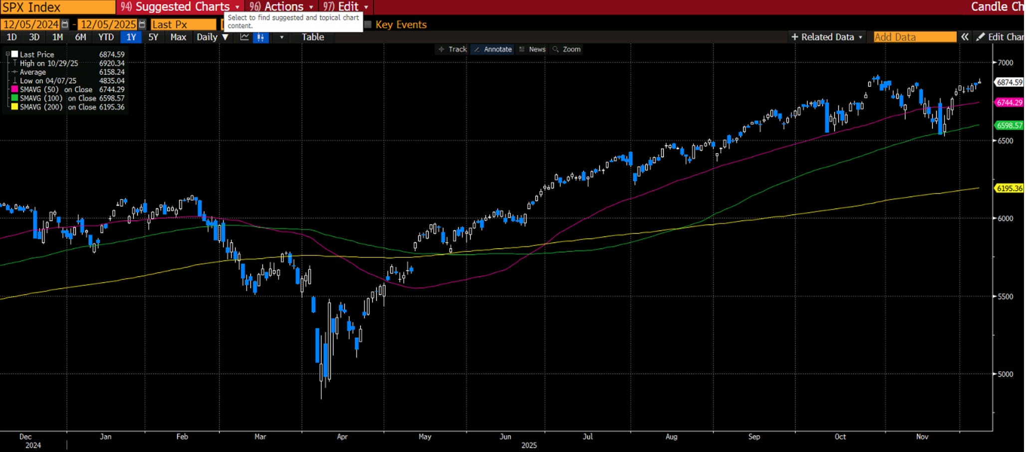 Iniziamo l`ultimo mese dell`anno con una sensazione quasi schizofrenica, da un lato l’S&P 500 continua a muoversi a ridosso dei massimi storici, poco sotto il picco del 29 ottobre, dall’altro la percezione diffusa è che il mercato abbia perso un po’ del suo slancio, fatichi a trovare una direzione chiara e viva più di nervi che di convinzioni.