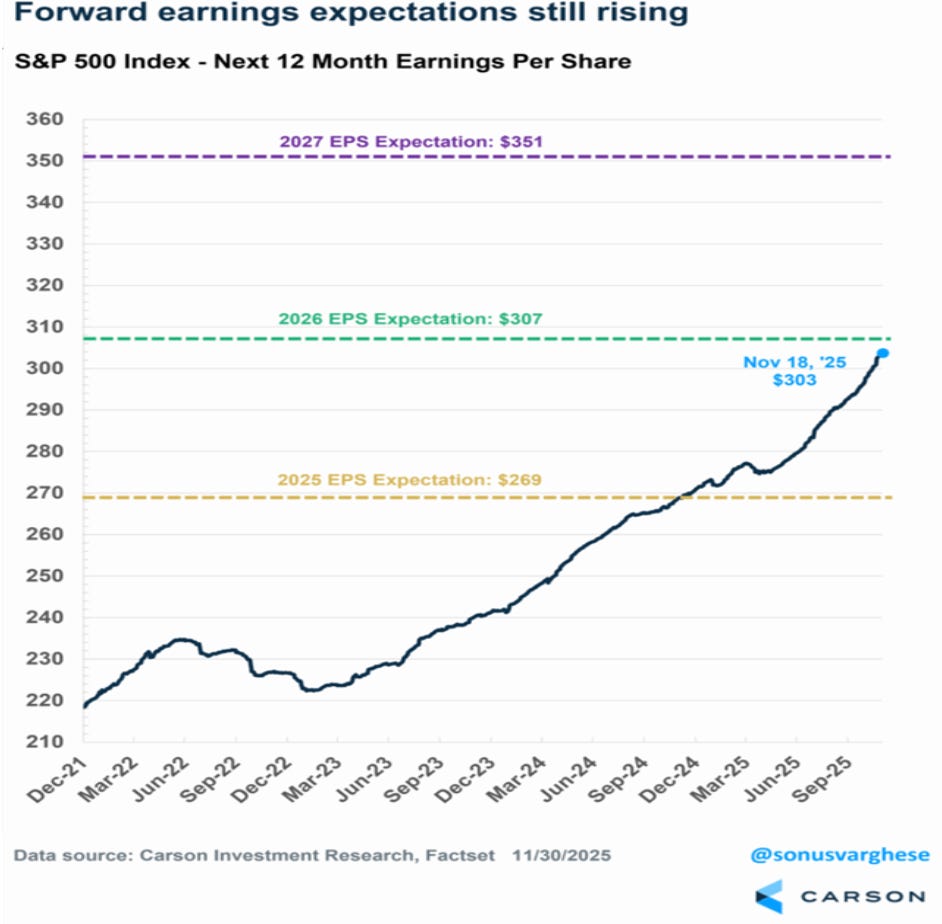 In mezzo infatti a questo rincorrersi di dati confusi, narrativa sull’AI, e Fed in bilico, resta un punto che, secondo me, va tenuto fermo. L’S&P 500 oggi è vicino ai massimi non perché “tanto sale sempre”, ma perché gli utili, finora, hanno rispettato le attese. In parallelo, però, i rischi stanno aumentando: sul mercato del lavoro, nella concentrazione dei rendimenti su poche mega-cap, nella possibile eccessiva fiducia sulla capacità della Fed di gestire perfettamente un equilibrio molto delicato tra inflazione, occupazione e stabilità finanziaria, nelle crescite attese degli utili per i prossimi anni. In questo tipo di fasi, il rischio non è tanto “stare investiti”, quanto il come stare investiti. Ha poco senso farsi prendere dal catastrofismo e azzerare completamente l’esposizione azionaria, ignorando la forza degli utili; ma ha ancora meno senso concentrare il portafoglio su pochi titoli o su segmenti dominati dalla narrativa, dando per scontato che nulla possa andare storto.
