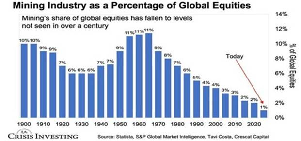La buona notizia è che il mercato è anche ricco di storie abbandonate e dimenticate, caratterizzate da valutazioni molto interessanti. Il peso del settore minerario ad esempio nel mercato azionario globale è sceso all’1%, il livello più basso in oltre un secolo. Eppure, con la transizione energetica in corso e la domanda strutturale di rame, litio e terre rare, le condizioni per un’inversione di tendenza sembrano sempre più mature. Storicamente, i migliori punti d’ingresso sono avvenuti quando il sentiment era al minimo e la quota di mercato era ai livelli attuali.