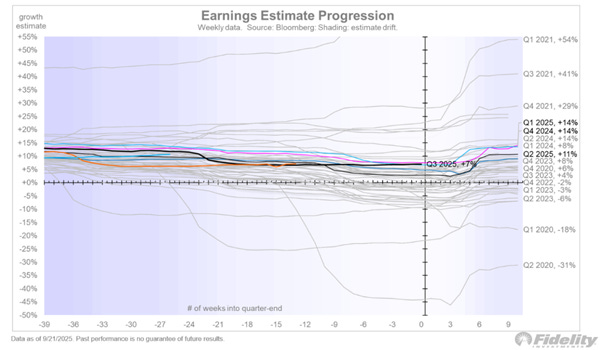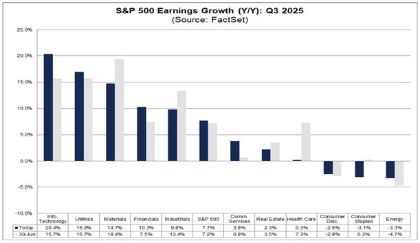 E` In arrivo la nuova stagione degli utili del terzo trimestre. Dopo una prima parte dell’anno sorprendentemente positiva con il Q1 e Q2 che hanno battuto le attese grazie a un miglioramento diffuso dei margini, ora gli investitori guardano al Q3 come banco di prova per confermare il momentum sugli utili. Le stime di consenso restano ferme attorno al +7% di crescita dell’utile per azione dell’S&P 500, ma ci si attende un possibile miglioramento con l’inizio della reporting season.