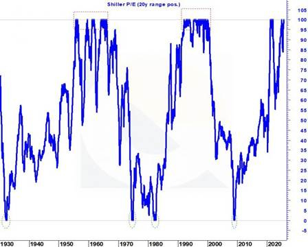 La solita considerazione importante da ricordare è però che i parametri valutativi fondamentali non si prestano a una lettura simmetrica. Quando i multipli raggiungono livelli estremamente bassi, queste fasi tendono a essere brevi e rappresentano spesso opportunità storiche di ingresso, perché il mercato reagisce rapidamente riportando le valutazioni verso la media. Al contrario, quando i multipli si collocano su livelli elevati, la situazione è molto diversa: tali condizioni possono protrarsi a lungo. Un esempio chiaro emerge analizzando il price/earnings in una finestra mobile ventennale: i momenti di estrema sottovalutazione appaiono rari e concentrati, mentre le fasi di sopravvalutazione tendono a durare più a lungo, diventando la norma piuttosto che l’eccezione. In poche parole i multipli possono restare elevati per molto tempo prima di tornare come faranno certamente, verso la media.