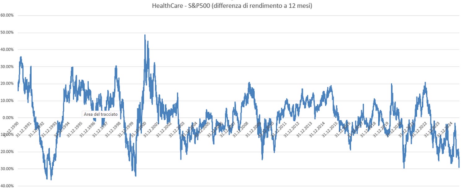 Questo ci evidenzia come il settore stia in generale vivendo una sotto-performance, ci troviamo infatti davanti alla peggior sotto-performance a 12 mesi del settore Health-Care dal 1990: