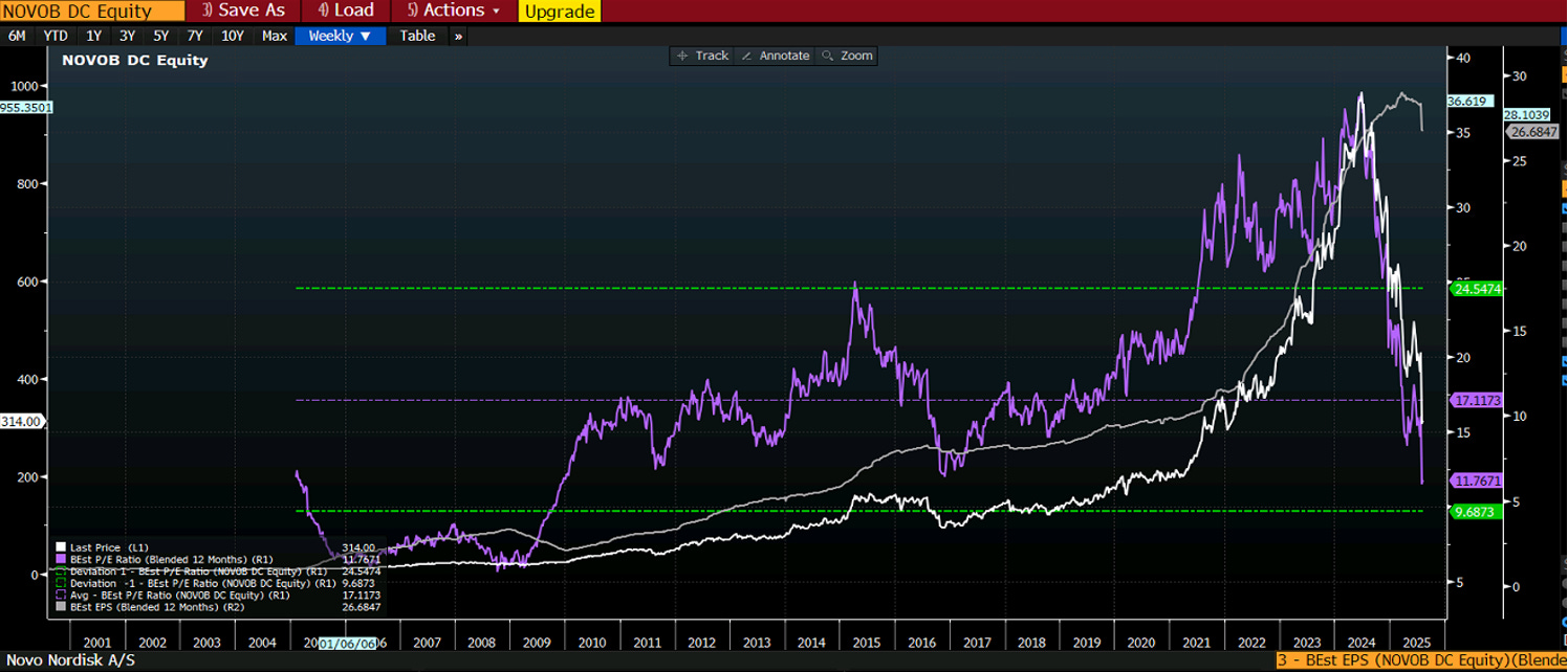 Lo sconto valutativo di Novo lo vediamo anche nel suo PE (linea viola) che è tornato al 2008. A quei multipli nel 2008 Novo non produceva i farmaci per il dimagrimento.
