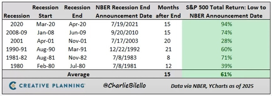 Se guardiamo alle ultime recessioni riconosciute ufficialmente dal National Bureau of Economic Research (NBER) ovvero l’ente che certifica i cicli economici negli USA, in media l’S&P 500 era già salito di oltre il 60% al momento in cui la recessione veniva dichiarata “terminata”.