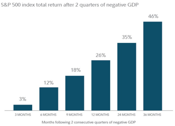 Molti credono che due trimestri consecutivi di crescita negativa del prodotto interno lordo (PIL) indichino che l'economia sia in recessione, ma non è necessariamente così. L'inizio e la fine di una recessione è determinato dal National Bureau of Economic Research, che considera una varietà di indicatori, non solo il PIL. Ad esempio, è stata dichiarata la recessione del 2020 da febbraio ad aprile di quell'anno, un periodo che non coincide con due trimestri interi di PIL. Inoltre storicamente, il National Bureau non ha annunciato l'inizio o la fine delle recessioni fino a diversi mesi dopo. Ad esempio, non ha annunciato la recessione del 2020, iniziata a febbraio 2020, fino a giugno dello stesso anno e quando ha comunicato la fine della recessione post-COVID, il mercato era già salito del 94%!