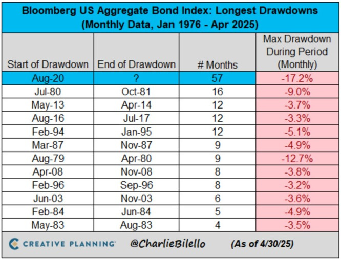 Durante periodi di recessione, la diversificazione torna a essere cruciale. Asset come le obbligazioni hanno storicamente offerto una copertura parziale contro il crollo dei mercati azionari. Il mercato obbligazionario statunitense è in calo da 57 mesi, il periodo di gran lunga più lungo della storia, un dato interessante da leggere in ottica contrarian e di protezione del portafoglio.