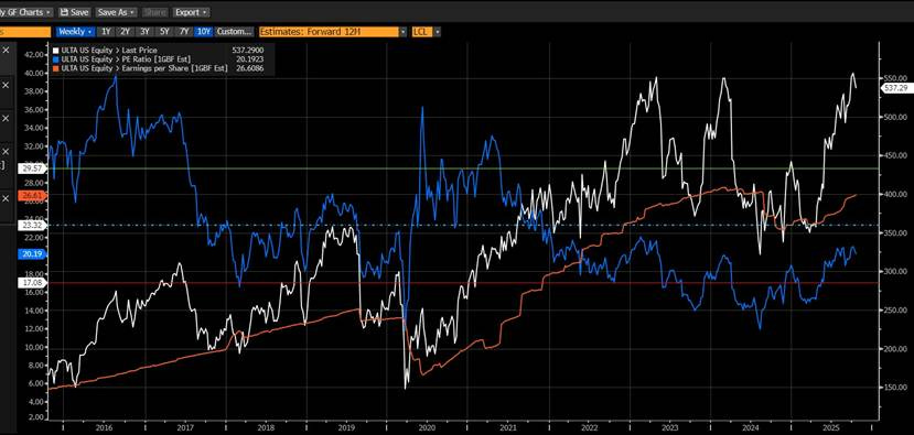 Ulta tratta oggi a ~15x P/E, ben al di sotto della media storica di 24x.