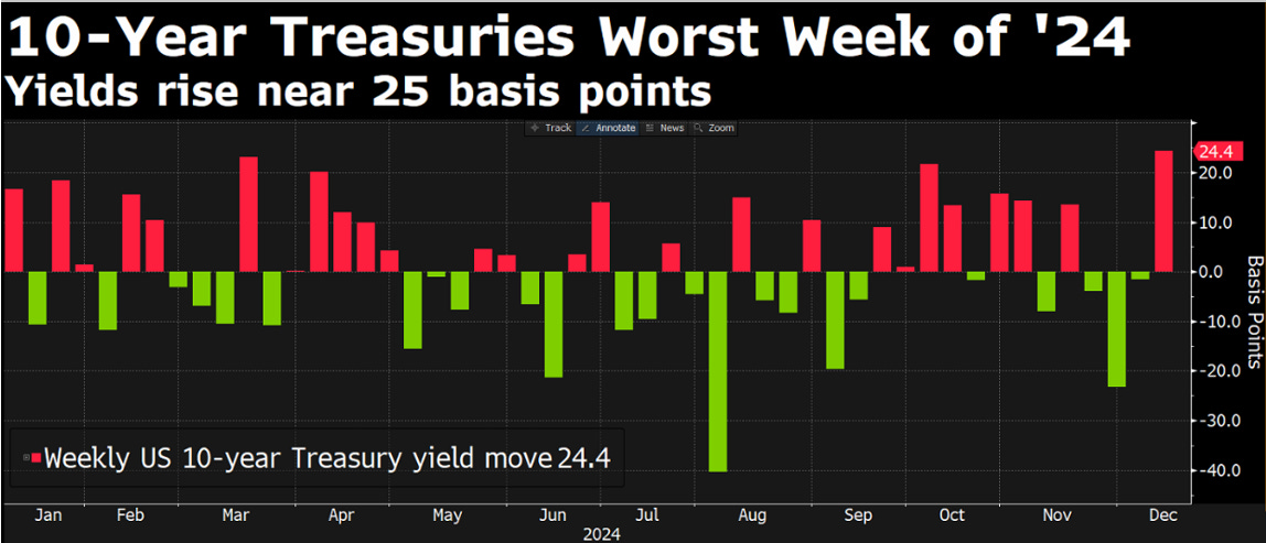 Altre banche centrali hanno tagliato i tassi durante la settimana tra cui la BCE che con il terzo taglio consecutivo da 25 punti base agisce in linea alle aspettative di mercato portando al 3,00% i tassi e rivedendo al ribasso le previsioni di crescita e di inflazione per gli anni successivi, con il mercato che si attende oggi per fine 2025 tassi al 2% in Europa. Anche la banca nazionale svizzera ha tagliato di 50 punti base per affrontare il problema opposto di molti paesi ovvero bassa inflazione ed una valuta forte.