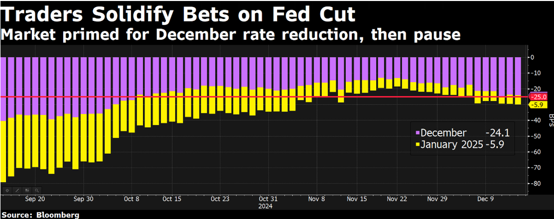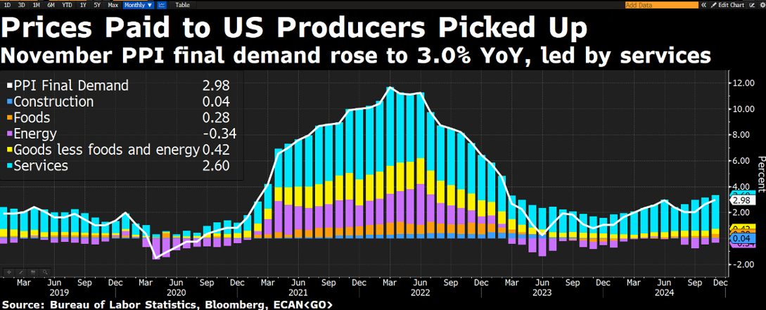 Tra i dati macro rilasciati negli stati uniti abbiamo avuto l`inflazione con Il CPI di Novembre aumentato dello 0.3% su base mensile e del 2.7% su base annuale in linea alle aspettative, con il percorso di riduzione dell`inflazione rimasto in qualche modo bloccato negli ultimi mesi, ma con un dato sufficientemente basso da consentire alla FED di continuare a muoversi verso il tasso neutrale. A sorprendere a rialzo è stato invece il PPI ovvero l`inflazione misurata sul lato dei costi alla produzione aumentati dello 0.4% su base mensile e del 3.5% su base annuale con entrambi gli aumenti che sono i più elevati da febbraio 2023 e l`80% di questi aumenti giustificati dai prezzi dei prodotti alimentari.