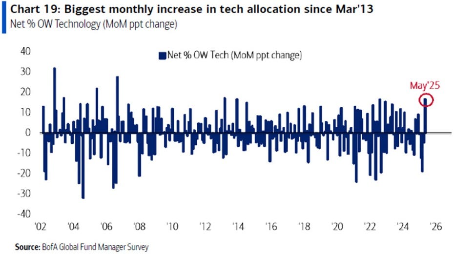 Anche l`allocazione degli investitori riflette questo sentimento di risk-on, con gli acquisti in tecnologia che registrano la più elevata variazione mensile dal Marzo del 2013.