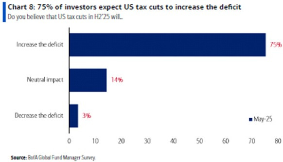 Nel sondaggio di Bank of America, si inizia anche a parlare del programma di taglio delle tasse per oltre 4500 miliardi di dollari atteso per la seconda metà del 2025 negli USA, visto dal 75% degli intervistati, come fonte di un incremento del deficit pubblico.